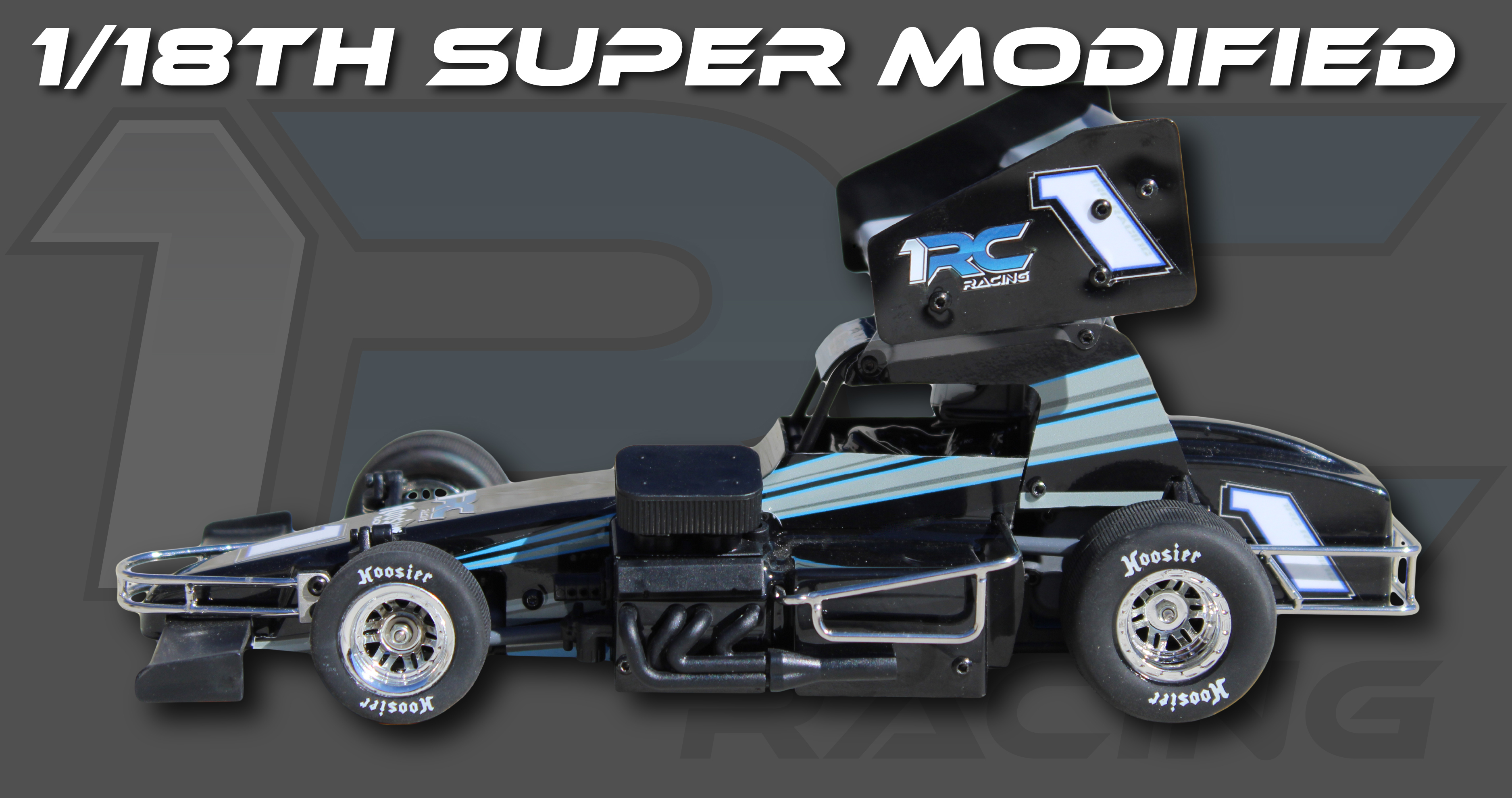 The design of the 1RC Racing Super Modified Car's chassis is to look, tune, and drive like a full-size race car. The 1RC Racing Super Modified features an open-wheel design with a scale offset chassis, wheels, and tires. The chassis with the faux big block V8 engine and driver are positioned to the left to enhance cornering. The 1RC Racing Super Modified features a realistic tubular-style chassis, metal front, rear, and side bumpers, and a realistic metal front axle. The rear axle assembly includes high-impact composite radius rods, a Panhard bar, and adjustable coil-over friction shocks. The scale details continue to the body with a sizeable top-mounted wing, creating massive downforce. On the front of the Super Modified is a nose wing to further add to the scale detail and to increase downforce. Like all 1RC Racing cars, each Super Modified Car contains full ball bearings.